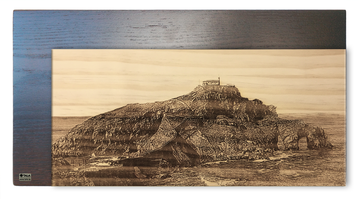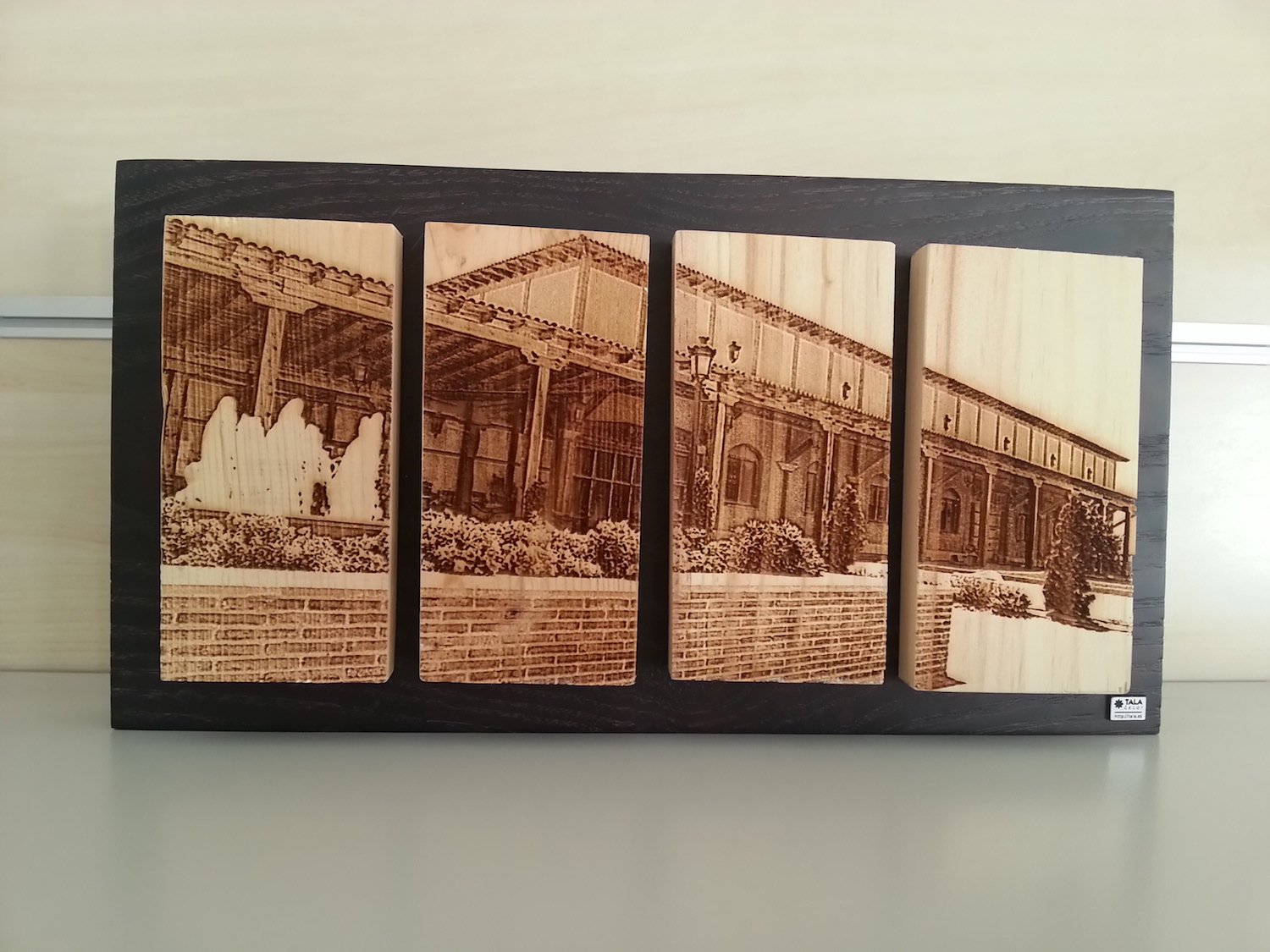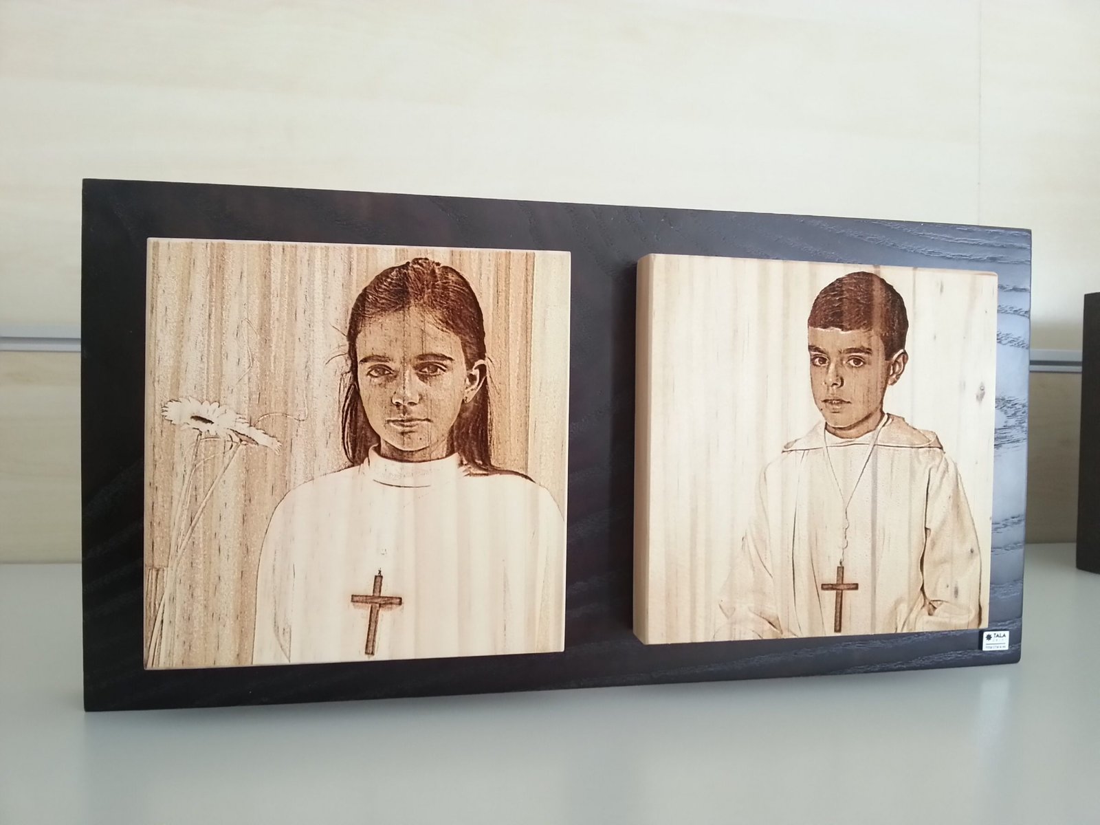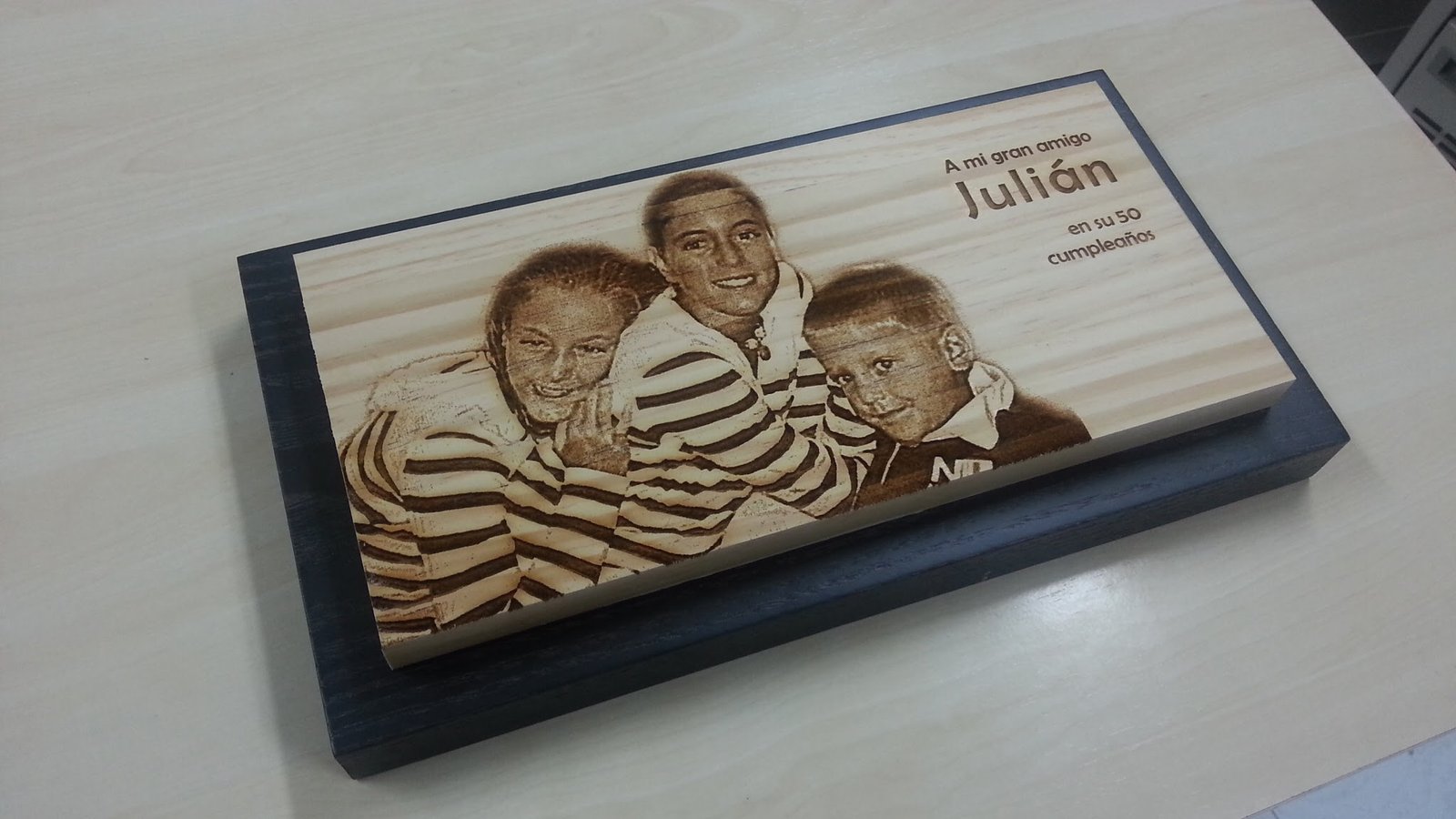 Es la estampación a fuego de una fotografía, dibujo, logo y, en general, cualquier tipo de gráfico, en una pieza de madera natural (de tonos claros), tallándola y generando un bajorrelieve con una fidelidad y precisión absoluta respecto del original.