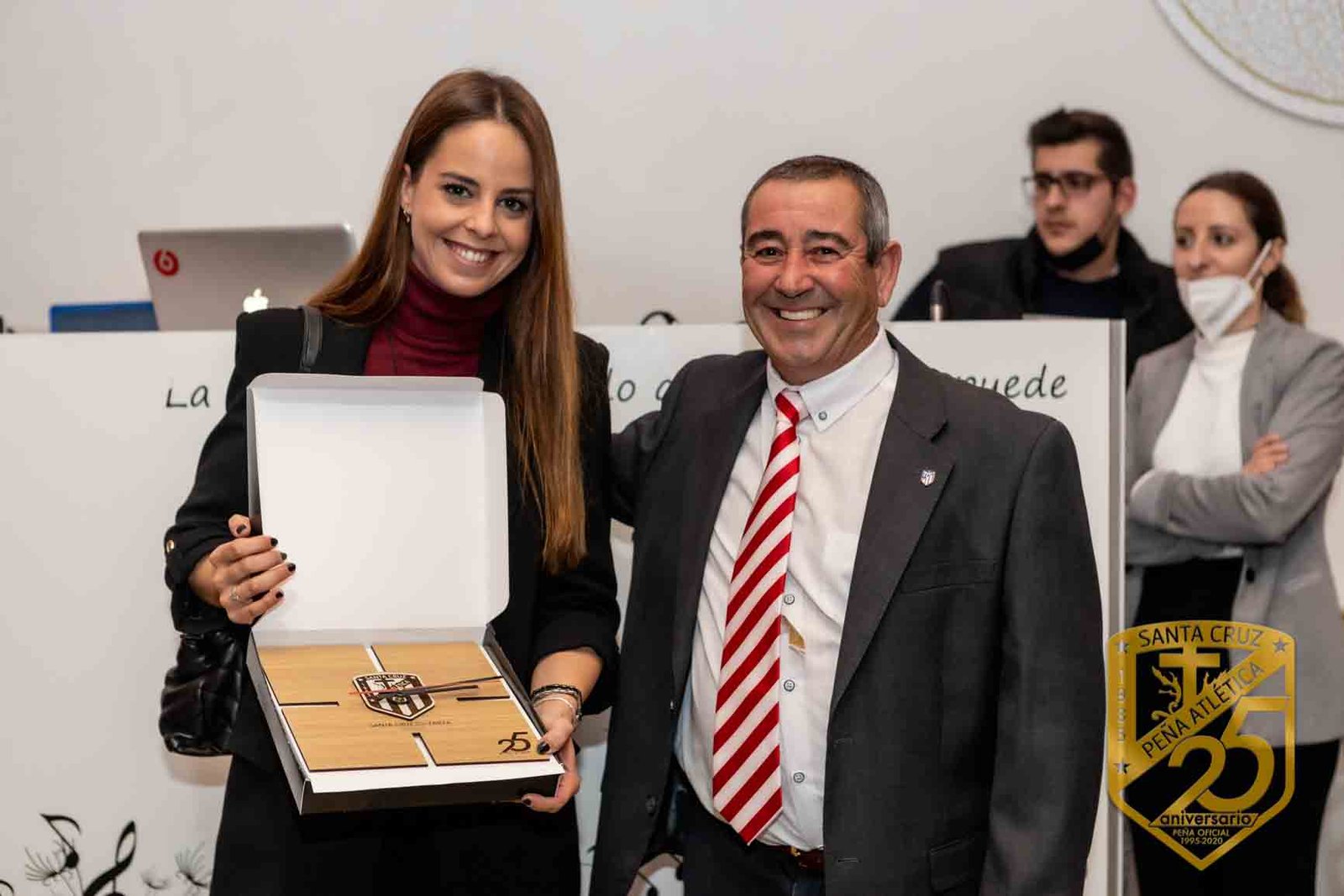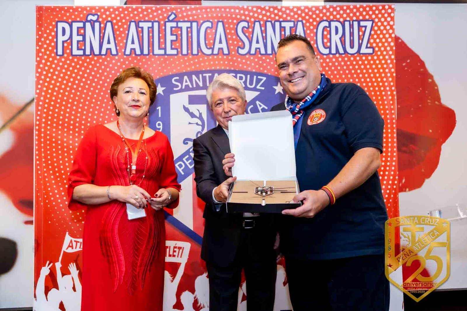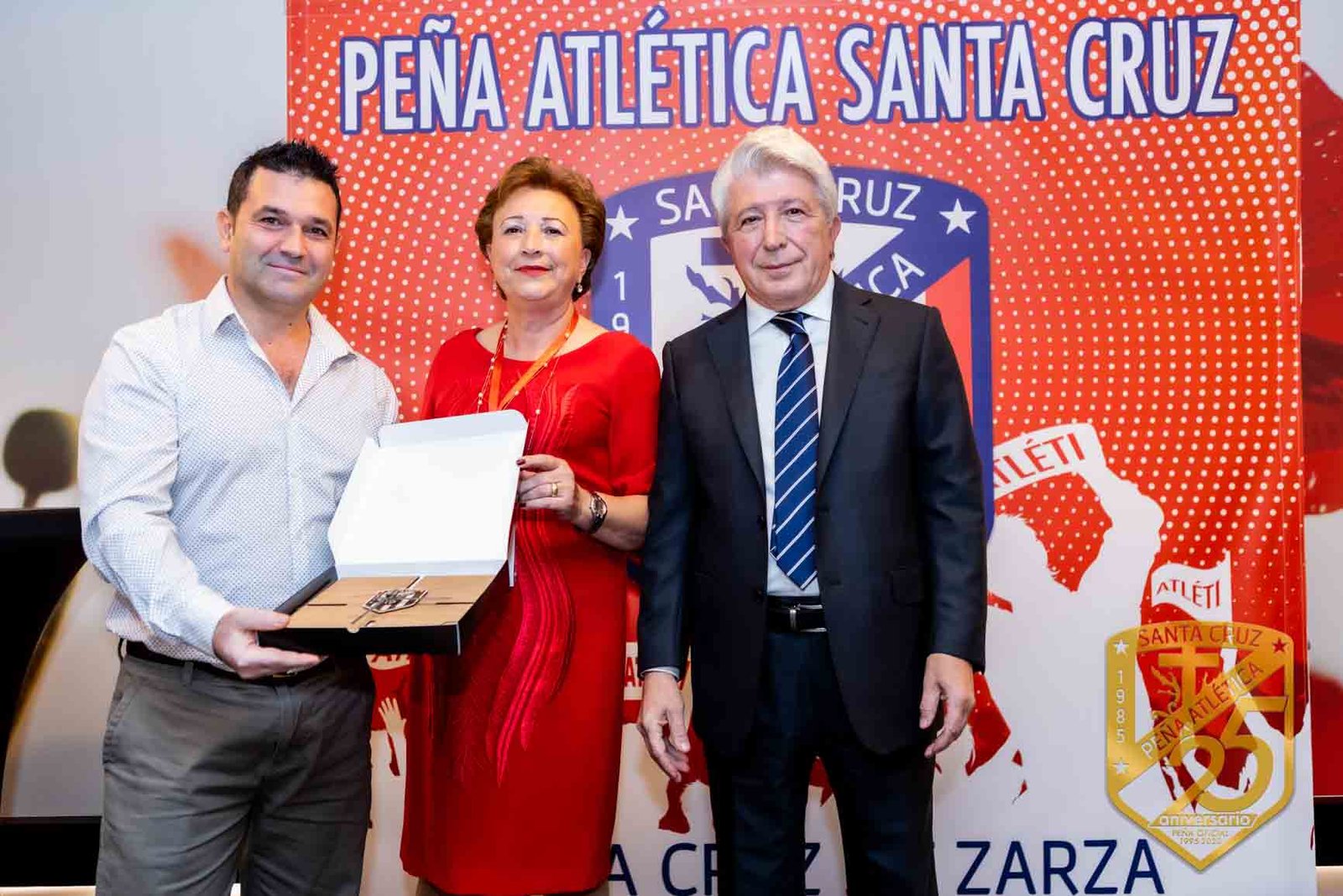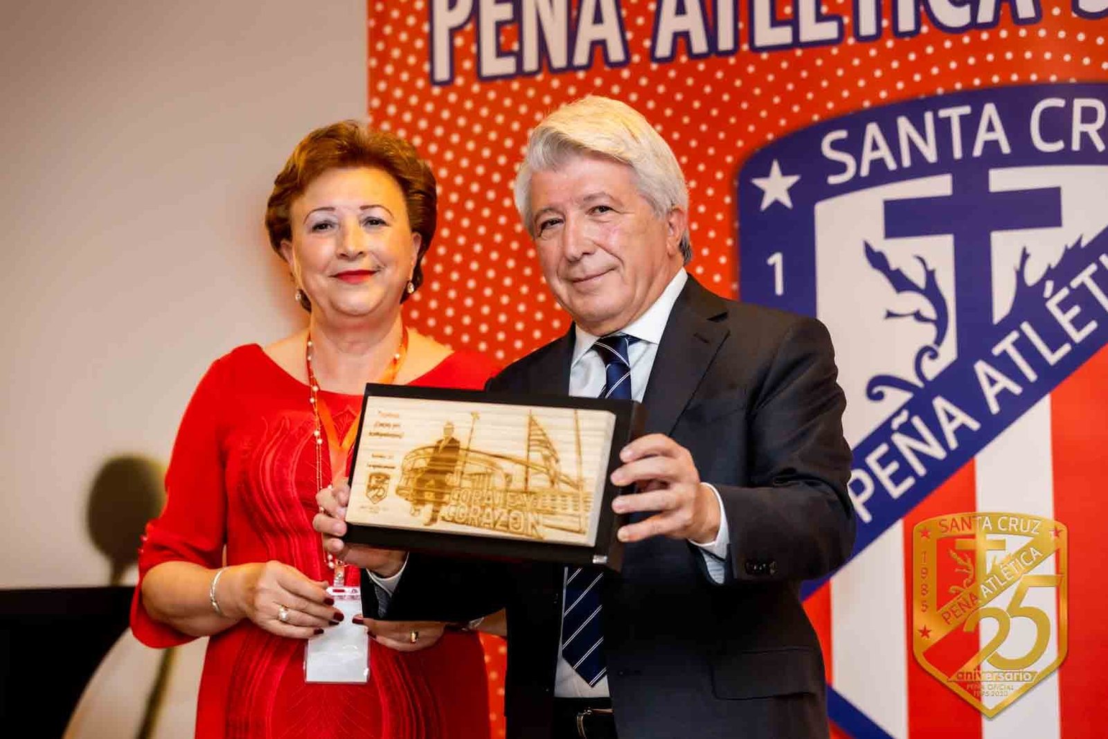 Enrique Cerezo, presidente del equipo Atlético de Madrid nos complació enormemente haciendo entrega de la placa conmemorativa diseñada por TALA NATURE por su 25 aniversario a Aurora Pavón, presidenta de la Peña Atlética Santa Cruz, en Santa Cruz de la Zarza (Toledo).